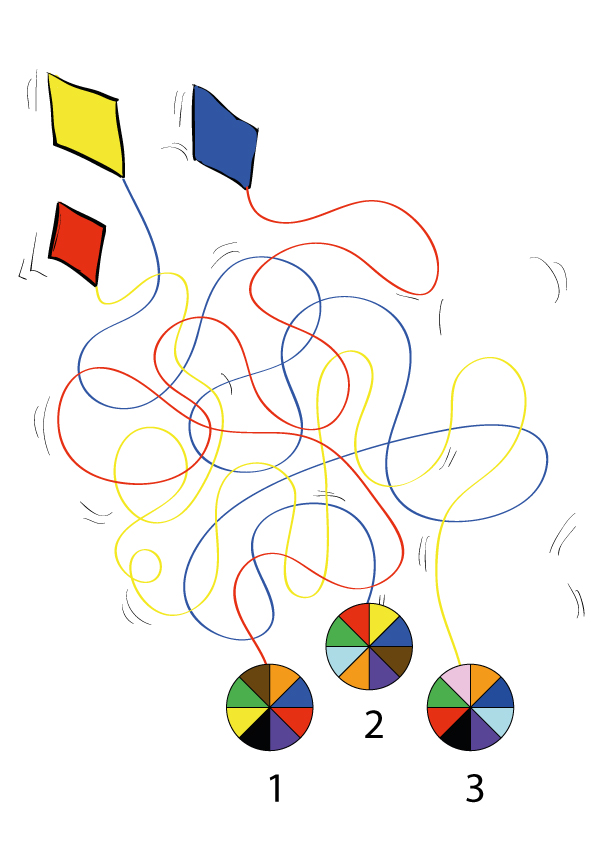 Po rozwiązaniu szyfru Tomek udał się na dalsze poszukiwania, w trakcie których natknął się na skrzynię do której były przyczepione trzy latawce na poplątanych linkach. Latawce były w trzech kolorach, od każdego odchodziła linka w innym kolorze niż latawiec. Zaś na końcu linek były trzy różnokolorowe koła. Tomek zorientował się, że aby otworzyć skrzynię, musi ustawić po kolei na kołach właściwe kolory, od których będzie wychodziła linka do prowadząca do latawca. Tylko jakie? Potrafisz pomóc mu rozwiązać to zadanie? 🙂