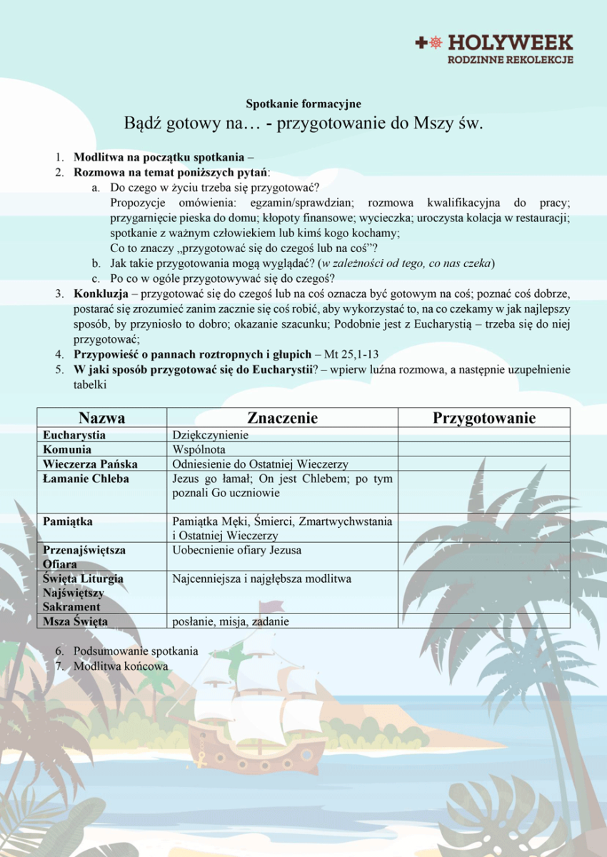 Kolejny dzień zbliżył ku końcowi… Przed nami widać już ląd, naszą „Ziemię Obiecaną”… Dzisiaj mówiliśmy o przygotowaniu, a więc przygotuj się, przygotuj do spotkania z Najważniejszym… Postaw przed sobą krzyż, aby móc na niego spoglądać, przygotuj swoje serce, otwórz je na Bożą obecność, wycisz wszystkie myśli, które mogą Cię rozpraszać, poproś Ducha Świętego, aby Ci w tym pomógł… I wreszcie skup się na Jezusie, na tym, że On jest, tu i teraz, przy Tobie… Posłuchaj, co przygotował dla Ciebie: