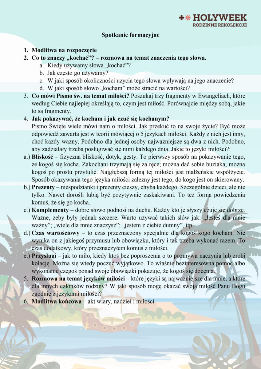 Jeszcze niedawno byliśmy na wyspie, odkrywaliśmy Skarb, a tu już jesteśmy w drodze powrotnej… Podnieśliśmy żagle i ruszyliśmy… Dokąd? Tam, gdzie nas posyłasz… Bo przecież powiedzieliśmy Ci „Oto ja! Poślij mnie!”… Dzisiaj kończy się kolejny dzień naszej podróży… Wiemy, że w pierwszej kolejności posyłasz nas do naszych domów, do naszych rodzin, do naszych parafii… Pomóż nam być Twoimi świadkami w tych miejscach, pomóż rozpoznawać i wypełniać Twoją wolę… Bo błogosławieni są serca, które płoną miłością do Ciebie, błogosławione ręce, które sieją ziarno Twojego Słowa, błogosławione dłonie wprowadzające pokój, błogosławieni Ci, którzy szukają tych, co poginęli z Twojej owczarni…