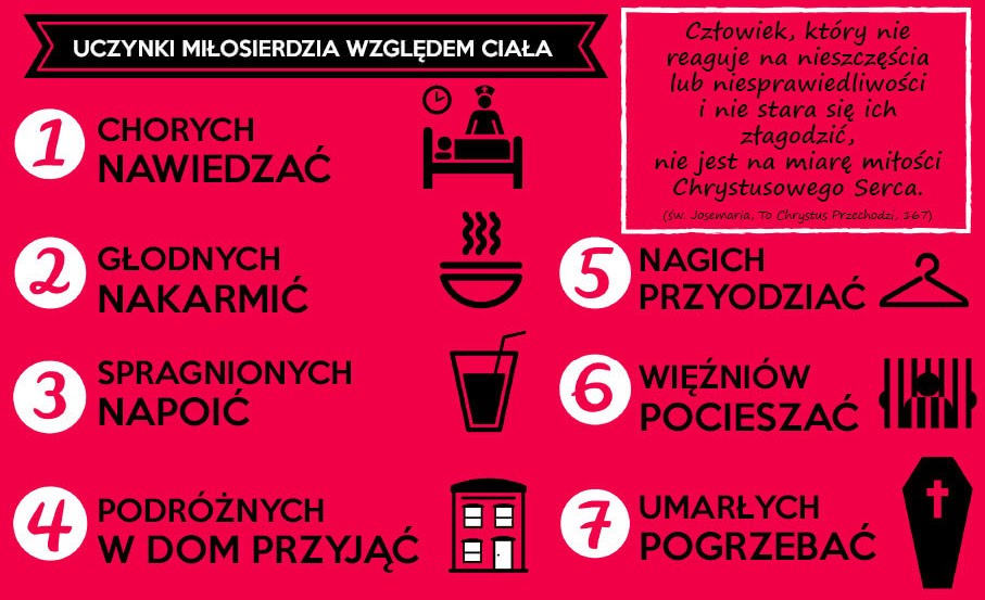 Drogowskazami na tej drodze są dla nas uczynki miłosierdzia. Każdy z nas może poprzez swoje małe czyny realizować je w swoim otoczeniu. Warto otworzyć swoje miłosierne serce i z miłością służyć tym najmniejszym.